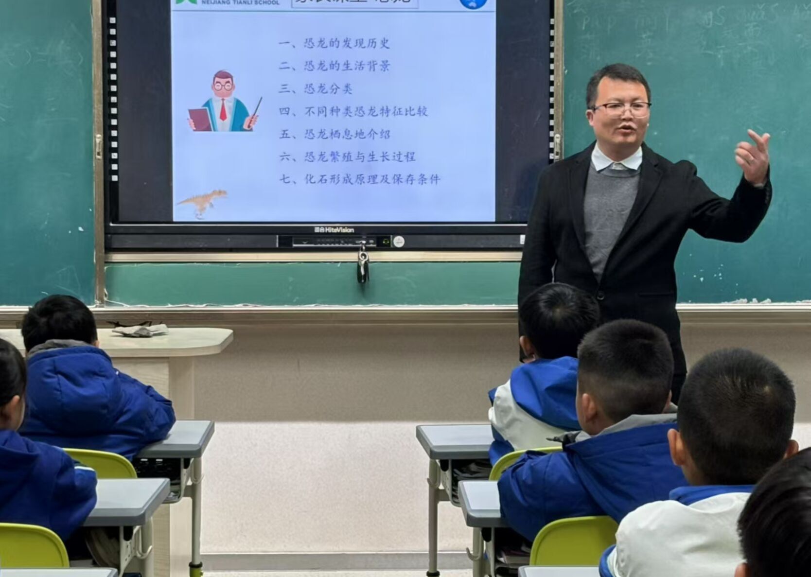2024年11月26日下午,公司教师刘心开博士受邀为内江天立公司100余名师生作了一场题为“四川恐龙发现史”的专题报告。刘心开博士结合“内江隆昌龙”的发掘过程,以生动有趣的语言、翔实的科考资料、丰富的研究成果,围绕恐龙的物种分类、生态环境、生活习性、繁衍方式、灭绝原因及四川省典型恐龙等六个方面,开展一堂优质的恐龙科普课,受到了师生的热烈欢迎。他们为内江发现恐龙感到惊讶,为地球环境突变导致恐龙灭绝感到震惊,员工杨瀚博说:“内江的宝贝又加了一个恐龙,以前只知道自贡有恐龙,没想到我们内江也有恐龙”,员工陈晗睿说:“环境保护很重要,以后要好好的保护环境”。 此次科普活动使环境保护观念深入公司,既激发了师生们的爱国、爱家情怀,又进一步将习近平总书记生态文明思想厚植少年员工心中。