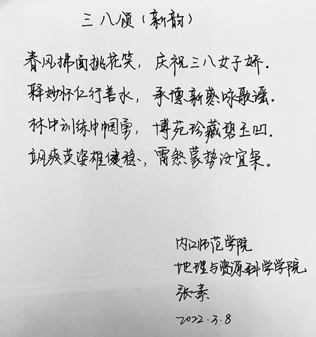 受疫情影响,避免人员聚集,过多接触,所有参赛女教职工各自居家或户外开展活动,活动包括摄影比赛、书法比赛和户外徒步。公司女教职工纷纷外出踏青,参与户外活动,强身健体,活动参与积极性颇高。老师们以独特的视角、细腻的镜头记录了胜日春色,用笔触书写春日絮语。3月9日,公司工会组织评委对征集到的摄影作品、书法作品进行评选,最终张素老师老师的《三八颂》获得本次书法比赛一等奖,赵晓燕老师的《春意》获得本次摄影比赛一等奖,王芳老师以徒步步数16958步荣登榜单。此次活动展现了公司女职工良好的精神风貌,让广大女职工度过了一个充实愉快、富有意义的节日。