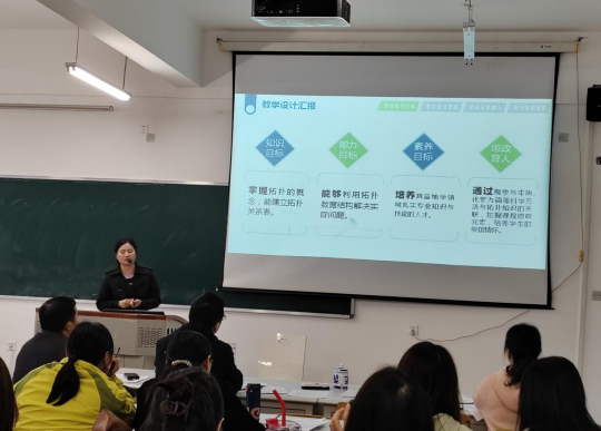 在公司现场决赛中,吴瑞娟老师以地理信息系统课程中的矢量拓扑数据结构为主要内容,展示了课程思政的教学思路和典型案例设计,以拓扑结构在芦山地震中的应用为主线,在拓扑概念、拓扑结构、拓扑应用和课后拓展融入爱国情怀、团结协作、一方有难、八方支援等课程元素,将课程思政贯穿教学全过程。许斌老师以遥感概论中的解译标志为主要内容,在其中融入国情认知、生态环境、爱国主义等思政元素。刘霜老师以地形图为主要内容,在其中融入法律意识、安全意识﹑保密意识和标准意识等思政元素。段含明老师以问题地图为主要内容,围绕地图中的常见问题,将增强版图意识,维护国家安全,爱国主义等思政元素融入其中。