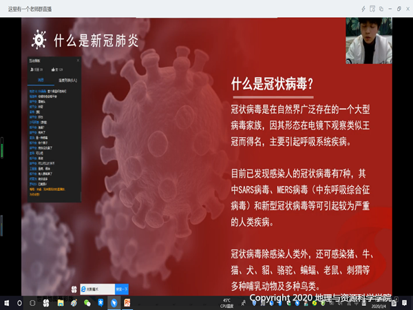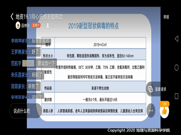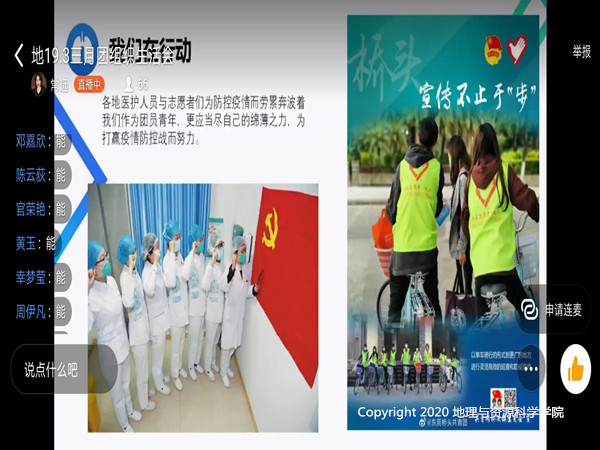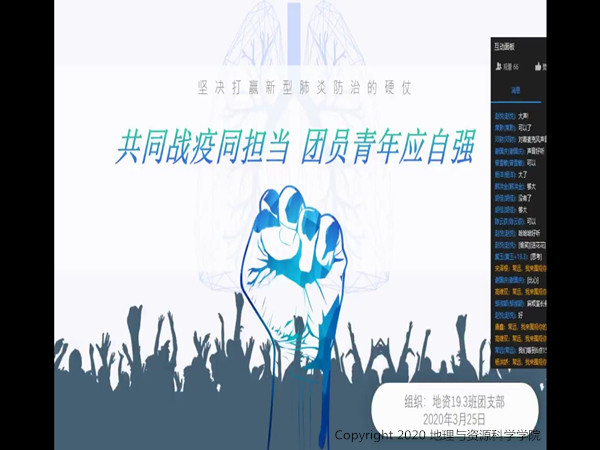 受疫情影响,这次特殊的团组织生活会仍然在线上开展,为紧跟党的步伐,把握时代脉搏,科学洞察疫情发展近况,各团支部充分利用网络资源,为同学们介绍新型冠状病毒的传播方式、概念、临床表现等内容,尤其为同学们讲解了疫情爆发以来,以习近平总书记为中心的党中央领导集体提出的“坚定信心、同舟共济、科学防治、精准施策”防疫主线,帮助同学们加深对新冠肺炎疫情及国家应对疫情的各项措施的了解。其中18级1班围绕“疫情防控相关内容”、“传染病防治法及相关规定”、“平时所学内容”开展了防疫知识竞赛,打破空间距离,让每一位同学都参与到疫情知识的学习中。各班同学心怀爱国心,积极响应团总支号召,充分发挥团员青年的责任和担当,在留言区里积极发言宣传防疫知识,分享身边的抗疫暖心故事。时间和距离似乎都不能消减地资学子对党和国家发展近况的关注,虽身居家中却心怀国事,每一位同学都在用自己特殊的方式与祖国共战“疫”同担当。
