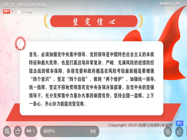 这次疫情对于中国来说是一次大考,同时也赋予了当代青年全新的时代使命感,作为民族复兴的时代新人,地资学子们纷纷表示,会努力使自己变得更加强大,用青春在党和人民最需要的地方绽放绚丽之花。