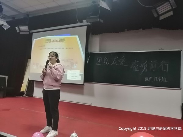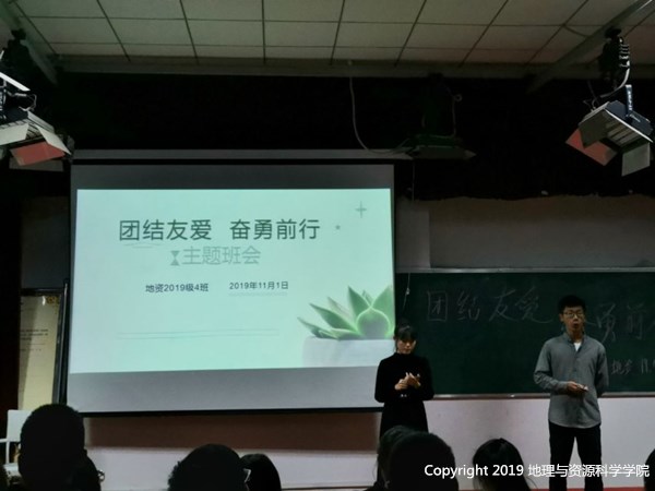 为了加强班集体的凝聚力,建设团结奋进、友爱和谐的地资19.4班,在班主任的指导和班委的精心筹备下,以“团结友爱、奋勇前行”为主题的班会活动于11月1日晚上7点在中文楼501举行。班会由赖益莲和李朋雨主持,公司罗杨洁副经理、班主任赵晓燕老师、班主任助理郑少杨师兄以及全班同学参加了本次班会。