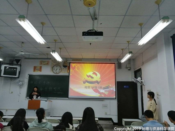 各班级在团支书的带领下,开始此次团组织活动。通过视频、PPT等形式集中观看学习祖国发展历程,了解新时代新风貌。同学们在学习后进行了讨论交流,发表自己的感想,部分班级的同学还以表演的形式来为新中国成立70周年献礼。19级1班的同学们进行了《我骄傲我是中国人》的集体朗诵,19级3班的同学们通过你说我猜的小游戏,活跃了氛围,加深了同学们对此次班会的理解。18级1班的班长宋睿在谈到对中国70年来发展的感想时说道“这70年来,有悲伤、有欢喜,但我们也都这样走过来了。我相信,未来,在我们青年人的脚下会走得更好。”17级2班的罗明月同学从神州大地沧桑巨变、70年来的光辉历程、70年来的伟大奇迹和70年来的历史启示四个部分向同学们进行介绍。通过这些形式的交流学习,极大得激发了同学们的爱国热情,使同学们更深入地了解了祖国发展的历史及现状。最后,各班班主任、班委进行总结,此次活动在各班班委干部的组织带领下圆满结束。