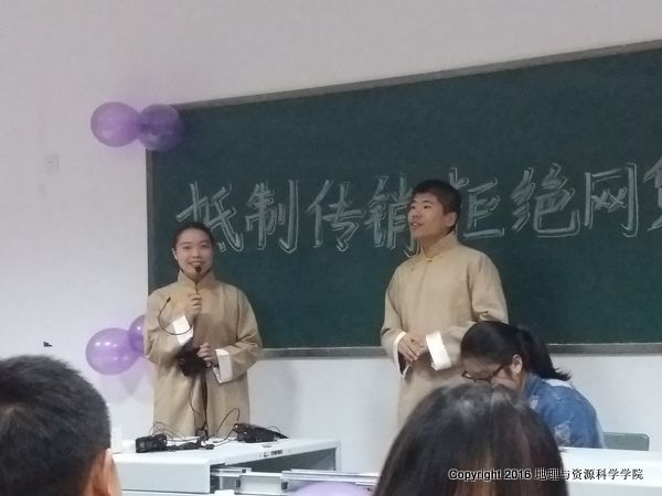 各班班会形式丰富多样。如11月18日16级在班会上表演的小品《推销不可轻信》,该小品与同学们的生活有着密切联系。提醒了同学们面对推销,一定要保持清醒的头脑,不能一时冲动。再如11月13日15.2在班会上表演的小品《就是要打到你关机》,该小品总结了现在骗子的一些套路,让同学们了解到在增强自身防骗意识的同时,也不要忘记提醒家长和周围的亲朋好友,以便揭穿骗子的新招。除了小品之外,各班以朗诵、歌曲等各种各样的方式提醒同学们在生活中提高防骗意识。