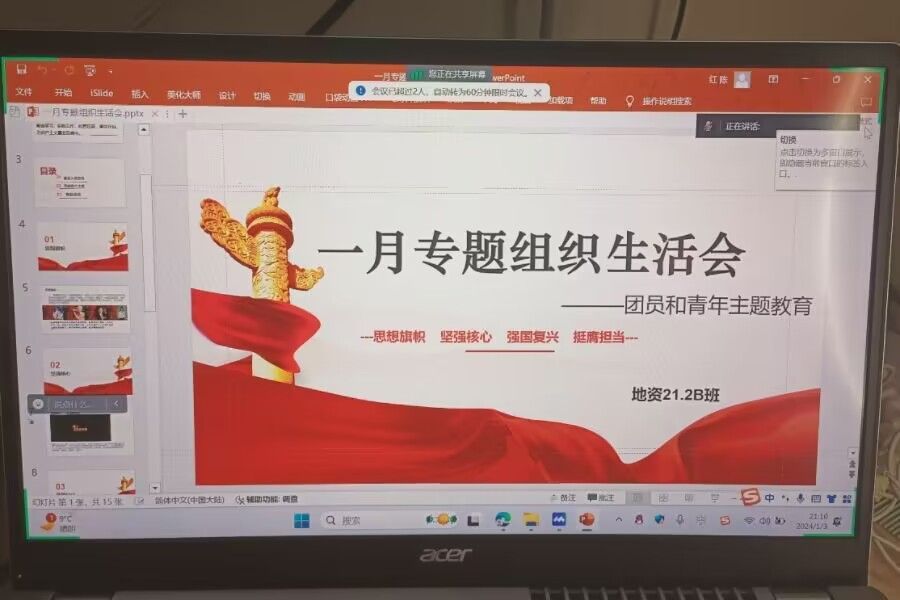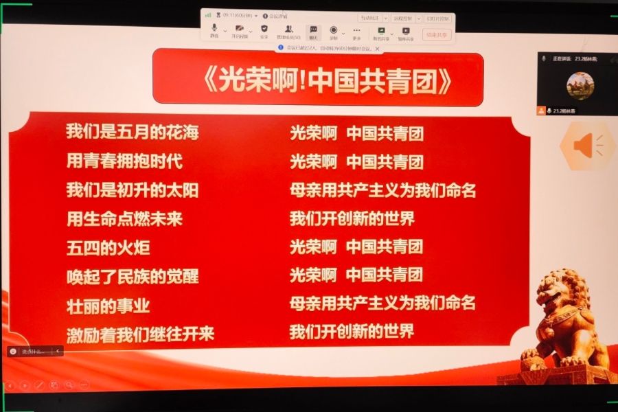 公司2023级2班团支部在1月2日21:30时,于腾讯会议开展了专题组织生活会。首先,团支部书记杨林燕进行点名,并对本次生活会作了简要介绍。随后,团支书带领大家重温习近平总书记《在庆祝中国共产主义青年团成立一百周年大会上的讲话》。重温时,全班高度认同要深刻领悟习近平新时代中国特色社会主义思想,切实践行社会主义核心价值观,做到知信行统一。最后,团支部书记总结发言,希望团支部成员聚焦提升政治意识、组织意识、服务意识,扎实推进团支部建设高质量发展。