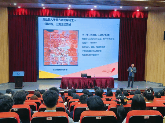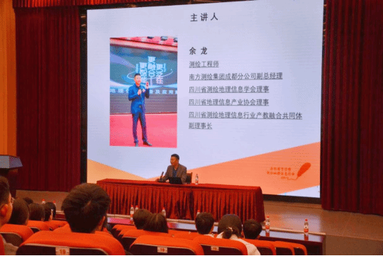 本次展览会的主讲人是来自南方测绘成都分公司的副经理余龙工程师,他从性能、技术和成本等方面进行讲述,让大家了解到南方测绘的国产测绘机器人采用了先进的传感技术和自主研发的算法,具备更高的定位精度、更快的数据采集速度,且相较进口产品更具价格竞争力。他的讲述语言生动、条理清楚、观点新颖、实例丰富,令在场师生耳目一新。