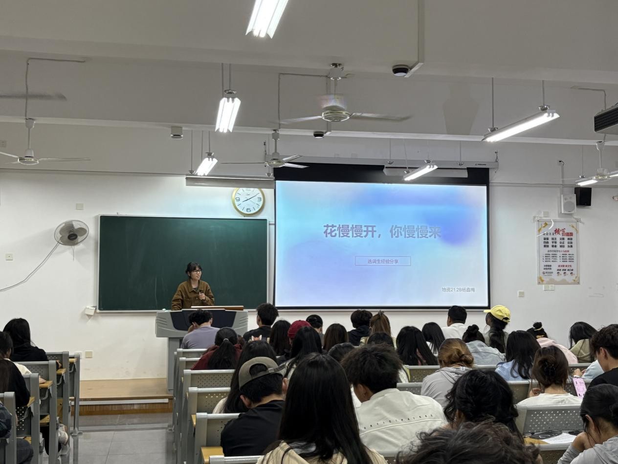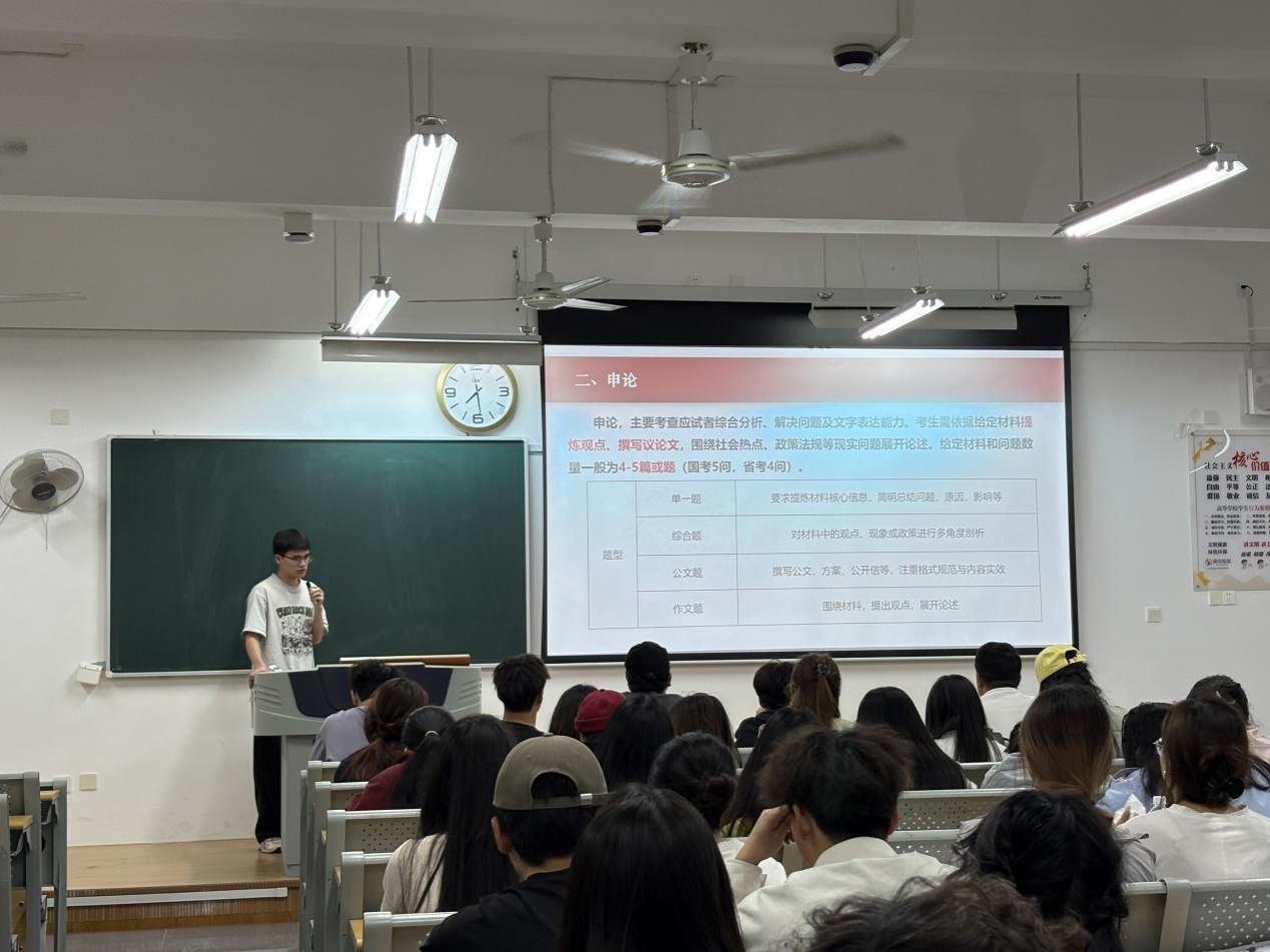 首位分享者程军(地理科学专业21.2A班)以笔试第一、面试第二的成绩考取广元市苍溪县选调生。他详细拆解行测、申论的复习节奏,并推荐“模块化训练+真题实战”的备考模式,赢得现场掌声。