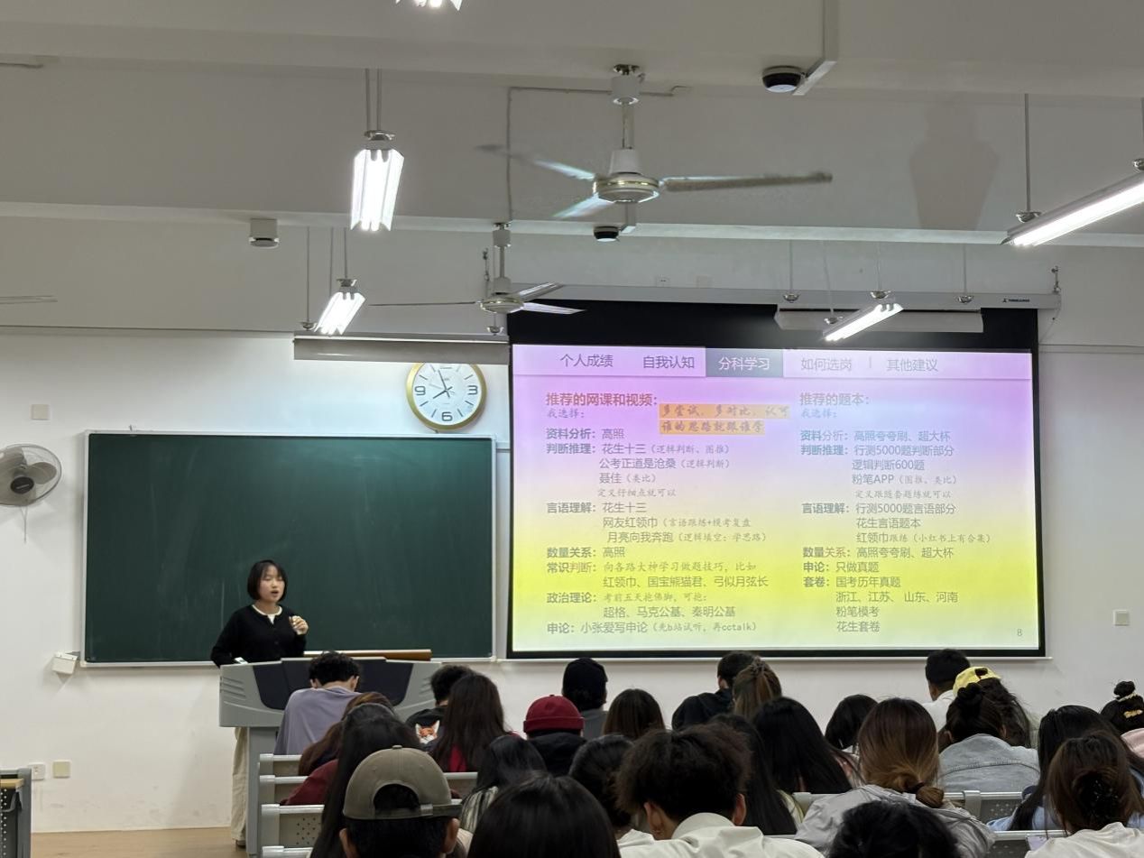 第二位分享人汪平(地理科学专业21.2B班)在四川省2025年公考中申论和行测总分达到147分,成功考取泸州市叙永县公务员岗位。她坦言自己并非天赋型选手,但凭借对知识点和错题的不断复盘巩固知识,最终实现上岸。她特别提醒学弟学妹们要早定目标,持续做好知识积累。