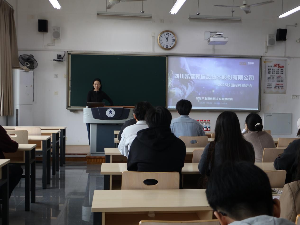 为拓宽公司员工就业渠道,搭建校企人才对接平台,2025年11月8日,在明德楼B121教室,公司举办四川里航科技集团有限公司、四川凯普顿信息技术股份有限公司两场校园招聘宣讲会,相关专业同学积极参与。