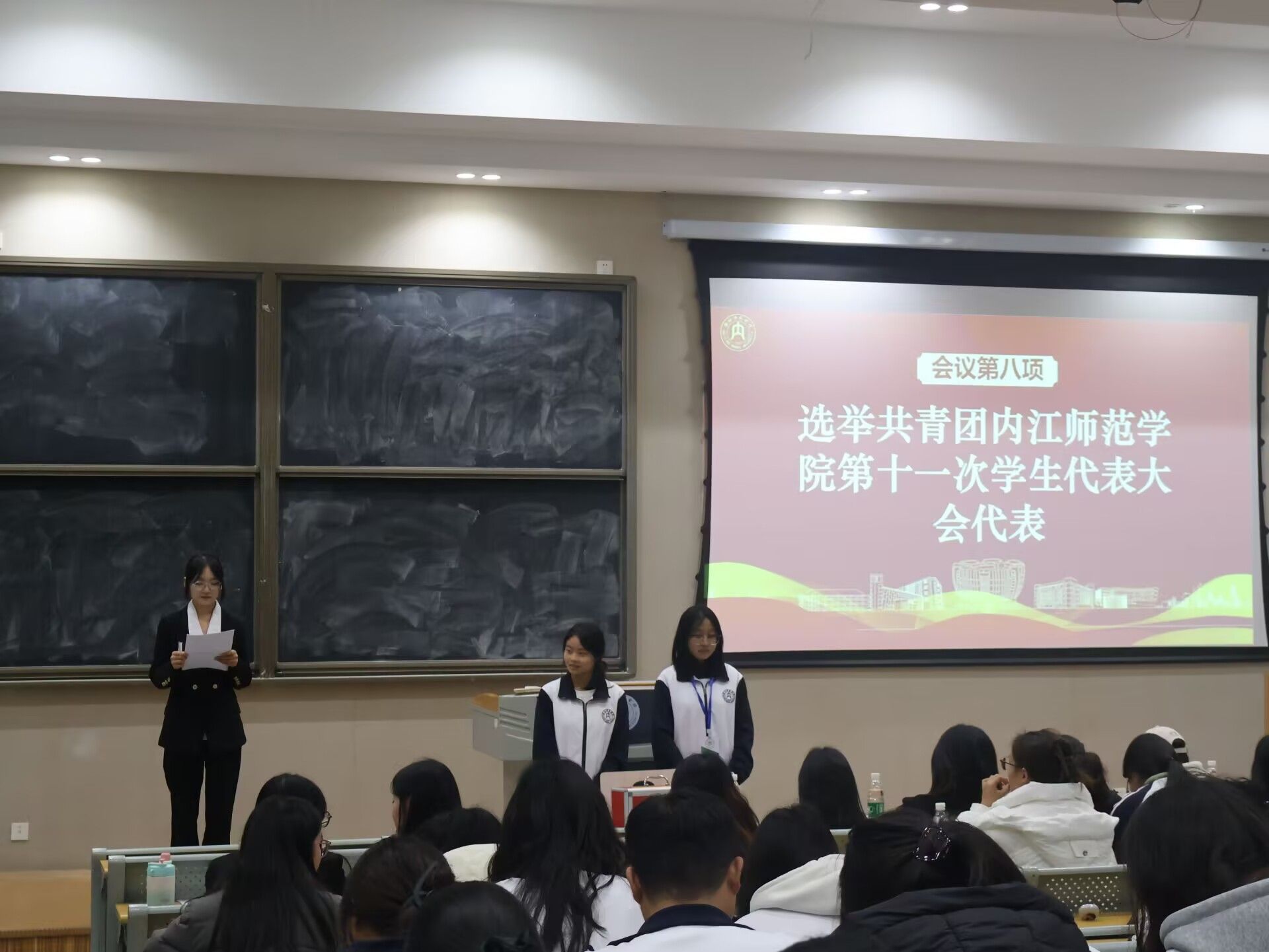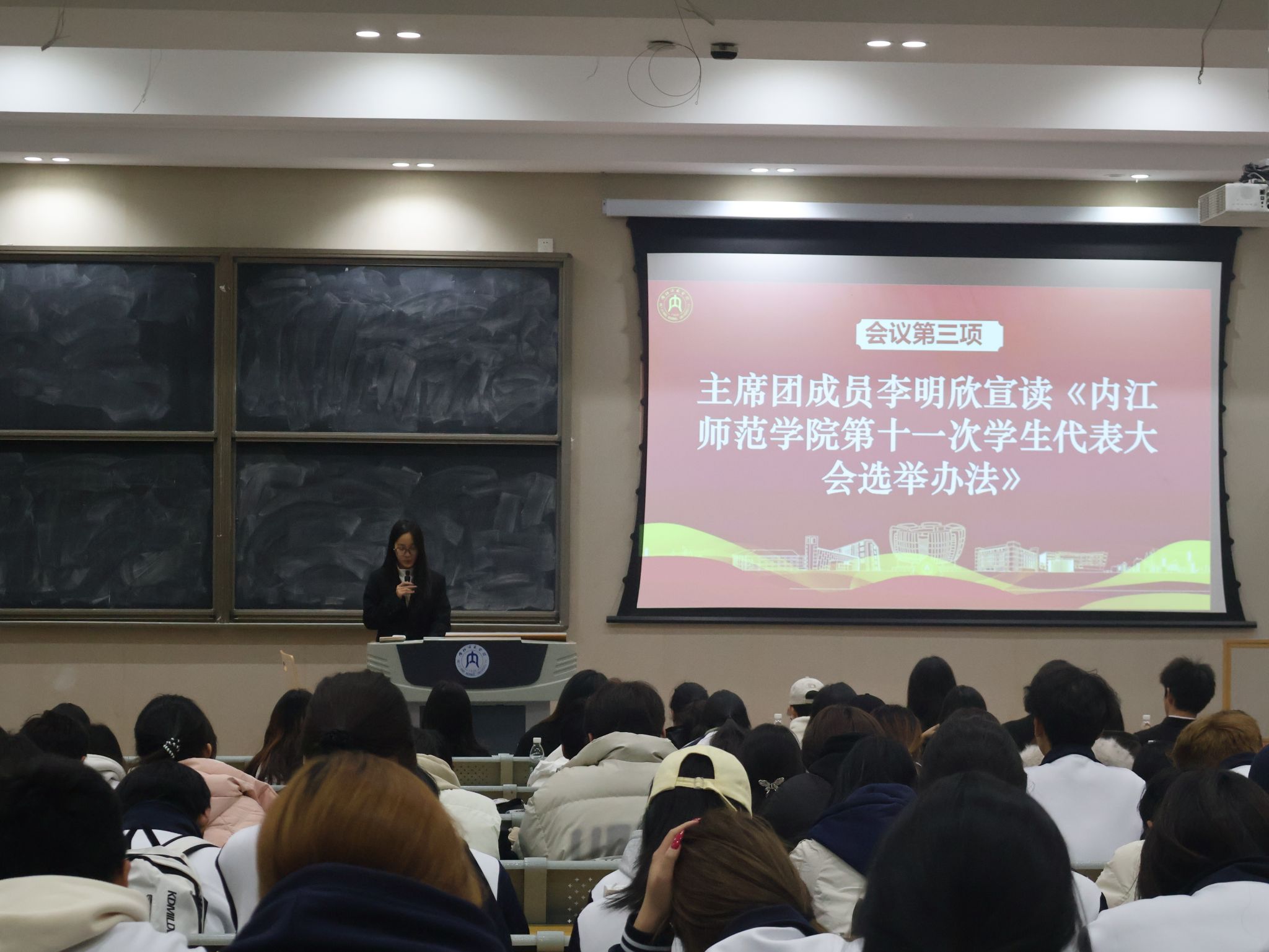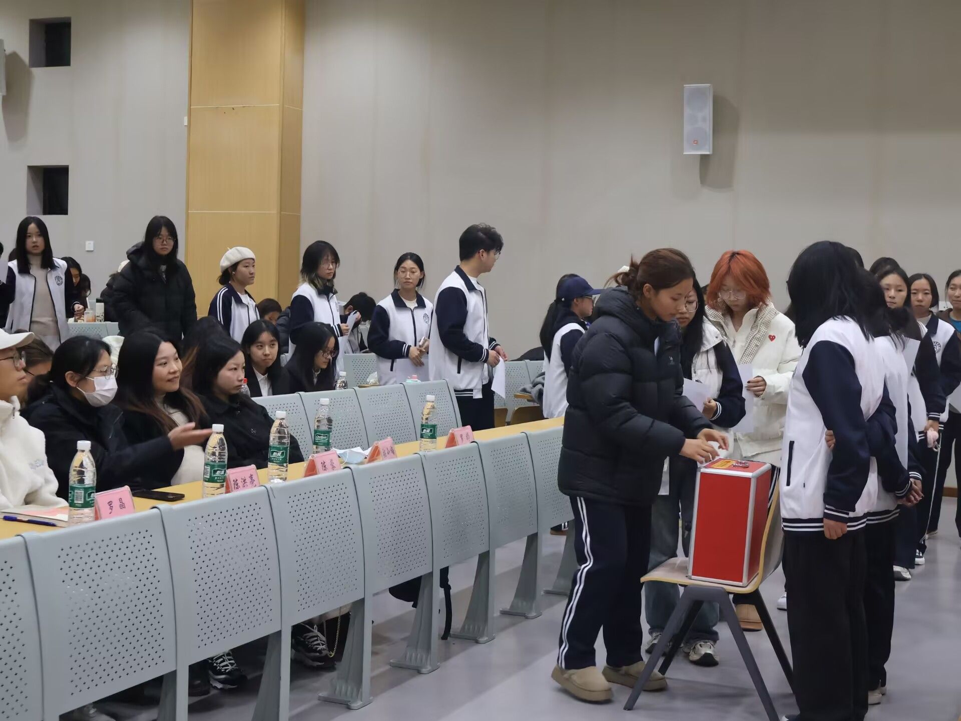 大会在庄严国歌声中启幕,主持人李锈娟阐明宗旨,立足新起点凝聚青年,赋能员工骨干提升服务质效。首先由执行主席龚妍鑫作年度工作报告,梳理过去一年员工工作的组织建设、活动开展等成效,明确后续工作方向,台下代表们全程专注,偶有轻声交流细节;随后主席团成员李明欣宣读选举办法后,代表们均以热烈掌声表决通过。选举环节前,主持人提醒各位参会人员“仔细核对候选人信息、规范填写选票”,现场秩序井然,代表们手持选票郑重勾选,投出选票时神情严肃,既严守会议纪律,又流露着参与民主事务的热忱。最终,大会顺利选出新一届员工会主席团、执行主席及13名校学代会代表,流程严谨高效。闭幕式上,选举结果经全体表决通过,大会在激昂团歌声中落幕。