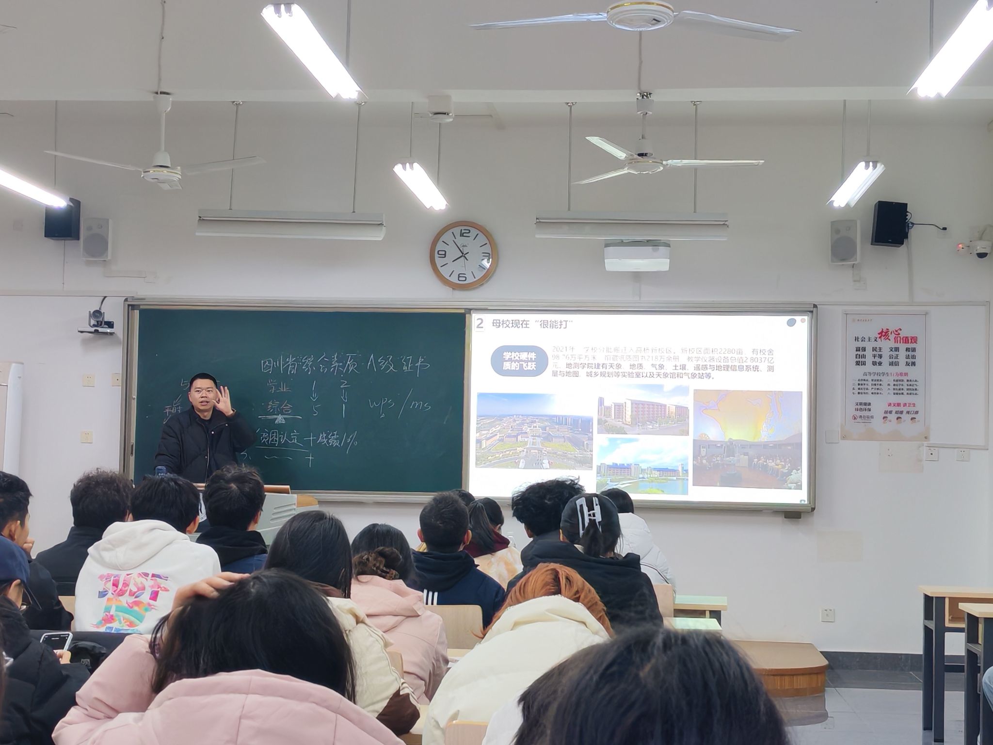 随后,班会延伸至学业与生涯规划层面。蒋景龙老师从知识积累、能力培养、职业发展三个维度展开讲解。他强调,地测专业学习需融汇理论知识与科研实践,着力培养独立思考、团队协作与创新能力。蒋老师还结合行业发展趋势,建议同学们尽早开展职业探索,做好长远准备,并以“心中有经纬,脚下有乾坤”勉励大家踏实走好大学每一步。