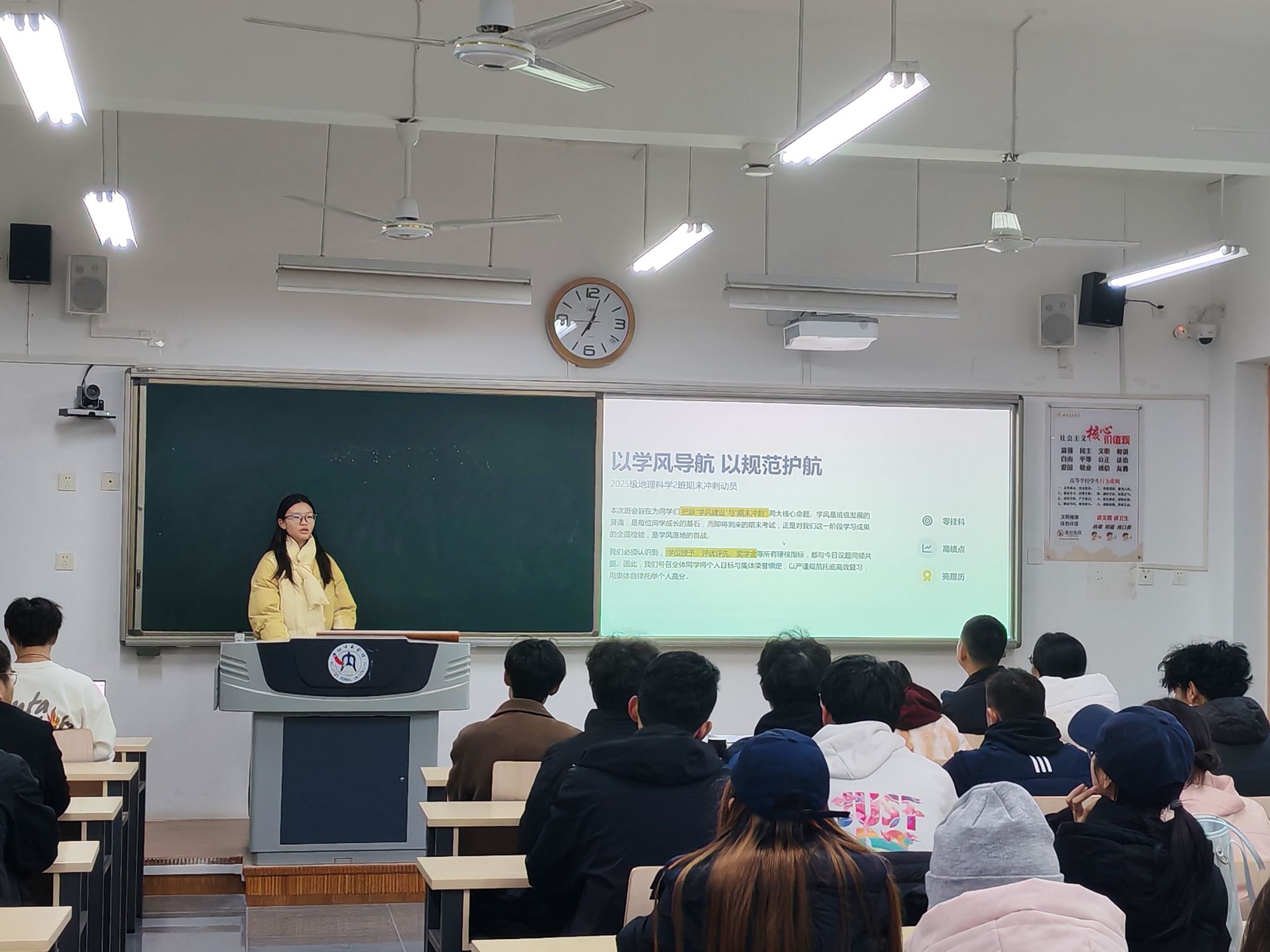 为引导员工明晰学业发展方向、科学备战期末考试、牢固树立诚信意识,地测25.2班于2025年12月9日在明德楼B314举行专题班会,围绕“学业规划、期末备考、诚信考试”三大主题展开深入交流。班会特邀23.2班优秀员工杨林燕、班主任蒋景龙老师共同参与,分别从员工视角与教师角度为同学们答疑解惑、指引方向。