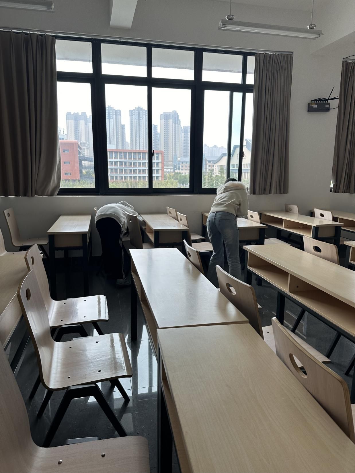活动现场,服务队成员们带着十足的热情与清洁工具,分工协作、有条不紊地投入劳动。有人仔细清扫走廊地面的杂物灰尘,有人认真擦拭教室门窗与桌椅扶手,有人细致清理角落的卫生死角,用实际行动践行劳动精神,让清洁工作覆盖明德楼教学区的每一处角落。