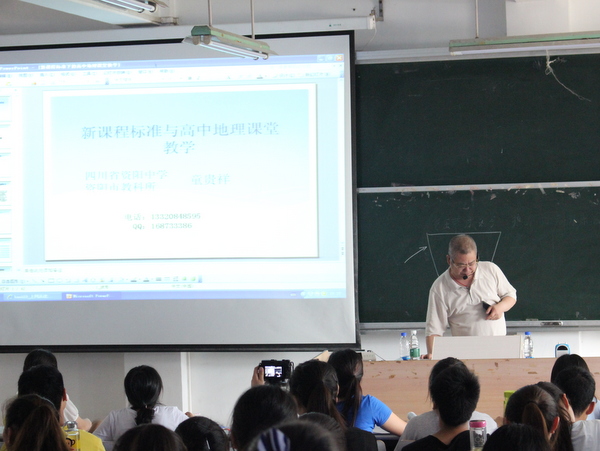 紧接着,童贵祥老师给员工们带来了题为《新课程标准下的高中地理课堂教学》的专题讲座。在讲座中,涉及到如何深化高中课程改革时,童老师谈到两个问题:一是培养什么样的人,二是怎样培养人。在谈到地理课堂教学改革时,他指出教学模式的流程应该是先学——后教——再思,而导学案便是进行这一教学流程的良好载体。同学们认真聆听,受益良多。