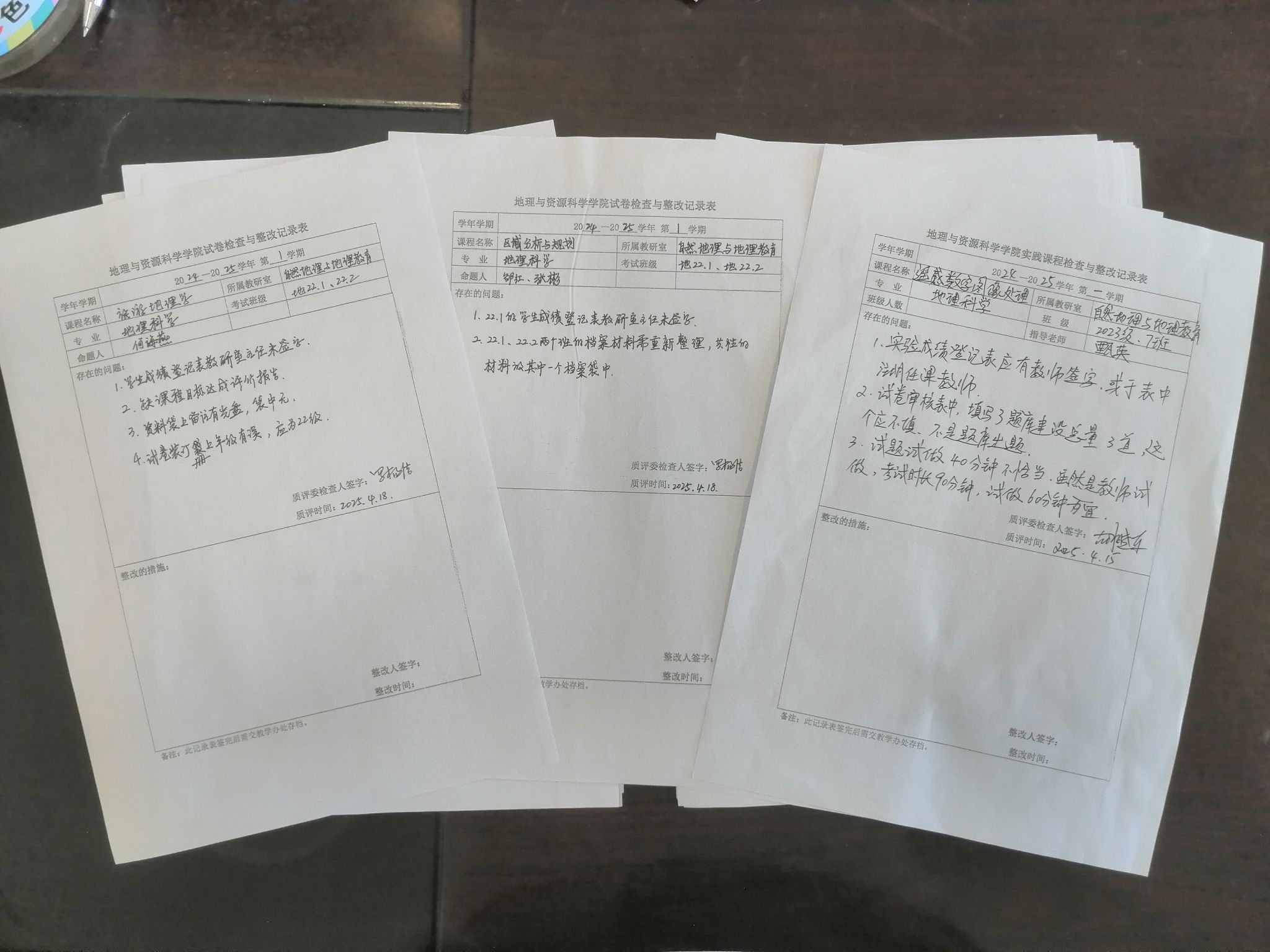2025年4月,地理与资源科学公司教学质量评价自评工作小组对公司2024-2025学年第一学期课程考核材料进行了专项质评。质评小组检查了地理科学、人文地理与城乡规划、测绘工程三个本科专业的所有专业课程考核材料,涵盖理论课程和实践课程。质评内容包括课程大纲、试卷、试卷审核表、参考答案及评分标准、平时成绩与期末成绩登记表、成绩分析表、实验报告及课程目标达成情况分析报告等相关课程考核材料。