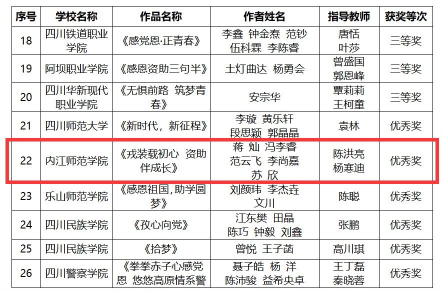 根据《四川省教育厅关于开展第二届“感恩资助心向党政策宣传我来讲”微视频征集活动的通知》,经各校各地评选推荐,教育厅组织专家评审,由公司师生共同创作的《戎装载初心,资助伴成长》在80部参赛作品当中脱颖而出,斩获优秀奖。