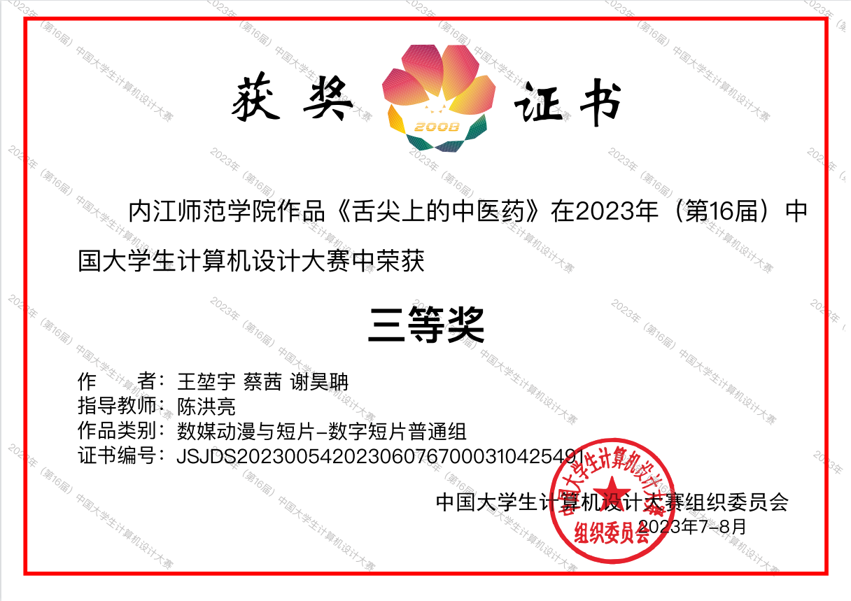 由陈洪亮老师指导的员工刘鸿文、李尚嘉和苏欣团队作品《土地荒漠化》和王荣怡、马文志团队作品《倒春寒》在微课与教学辅助组分别荣获国家级三等奖,王堃宇、蔡茜和谢昊聃团队作品《舌尖上的中医药》在数媒动漫与短片组荣获国家级三等奖,参赛选手们在比赛中展示了师范生在微课与教学辅助的综合素养和数媒动漫与短片的创新能力,充分体现了公司学子的科技素养和实践能力。