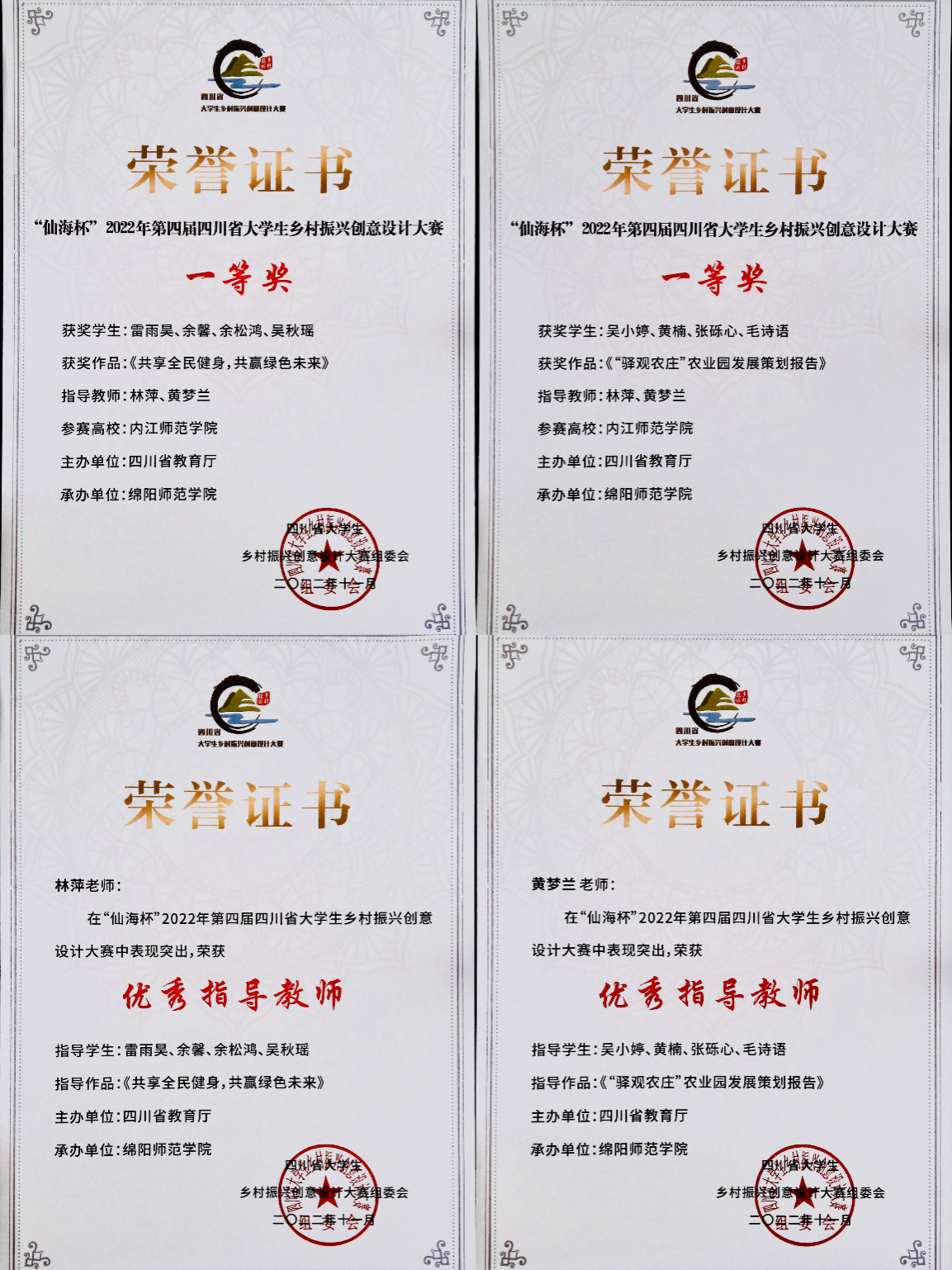由公司林萍、黄梦兰两位老师指导、人文地理与城乡规划专业员工组成的参赛队伍经过长时间精心准备,提交的乡村人居环境规划设计作品(有效作品288组)和发展策划报告作品(有效作品125组)从包括西南交通大学、四川农业大学等众多高校在内的作品中脱颖而出,凭借突出的创新思维和实践能力荣获两项一等奖,两位老师也荣获优秀指导教师,取得了公司参加本项赛事以来的最好成绩。