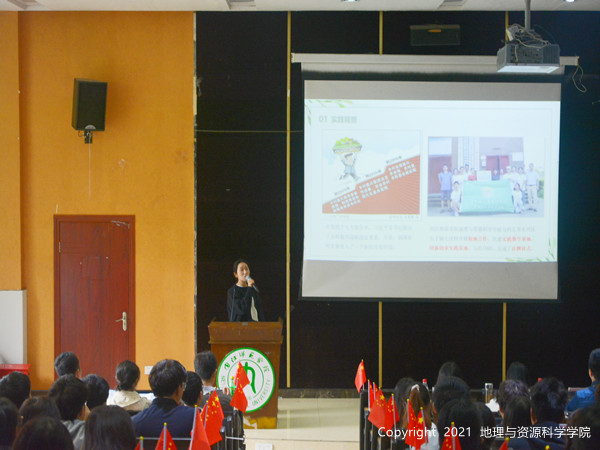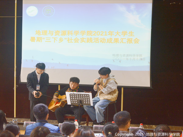 会议伊始,青乡连?农兴实践团、“绿色知识行”环保科普团队、“逐梦计划”优秀代表、分散实践优秀代表分别进行了实践成果汇报。其中青乡连?农兴实践团紧密结合乡村振兴的实践主题,详细介绍了实践期间开展的各项活动以及收获和感想。实践过程中,有辛酸、有快乐,但他们的脸上始终洋溢着灿烂的笑容。“绿色知识行”环保科普团队积极贯彻环保理念,用行动践行绿色环保工作,开展“环保知识宣讲”、“生态环境调研”、“关爱环卫工人”等活动,顶着高温天气清理河道垃圾。两个团队的汇报让大家对乡村振兴和保护环境有了更加深入地了解,也看到了团队成员们的努力和付出。此外,汇报会上各团队还带来了精彩的表演,带动会场氛围,使汇报会更加丰富有趣。团队汇报结束后,参加逐梦计划的武文玲同学汇报了自己的实践感受,她简单介绍了什么是逐梦计划,并分享了自己在中江县人民政府政务服务中心的工作内容和感悟收获。刘飘飘同学作为分散实践的代表,介绍了自己在安岳血浆站的工作经历和收获,尤其谈到了自己在刚进入大学的时候,一次“三下乡”社会实践汇报会上师姐演唱的歌曲为她埋下了爱和奉献的种子。