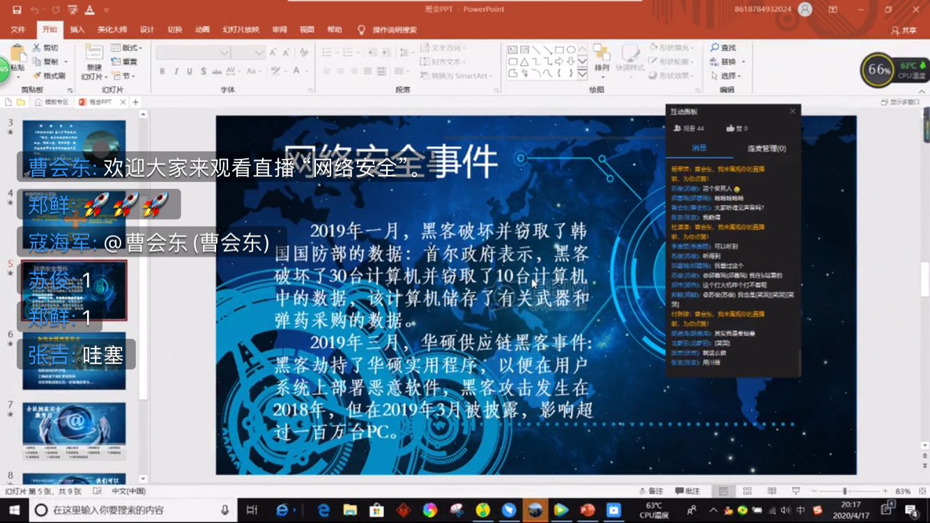 今年受新冠肺炎疫情影响,同学们不能聚在一起召开班会,但这丝毫不影响大家的热情。其中,2018级3班于4月17日晚7:00通过钉钉平台以直播的方式举办了“网贷及网络信息安全”主题教育活动。班主任为大家讲解了总体国家安全观以及相关法律法规,并通过真实事例让大家感受到网络安全的重要性。此次活动,让同学们的国家安全意识进一步增强,防范和抵御安全风险能力得到了提升。