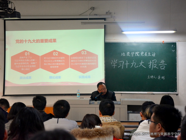 龚彬书记首先向大家介绍了本次党的十九大会议的主要议程和重要意义,并从:党的十九大的主题和主要成果、习近平新时代中国特色社会主义思想、过去五年的历史性成就和历史性变革、中国特色社会主义进入新时代、我国社会主要矛盾的变化、关于两个一百年奋斗目标的战略部署、我国经济社会发展的重大战略部署以及坚定不移推进全面从严治党八个部份进行报告。会上,龚书记提到以“不忘初心,牢记使命”为主题的党的十九大的主要成果概括为七个“新”和三个“成果”,既新时代、新矛盾、新使命、新思想、新方略、新征程和新部署以及政治成果、理论成果、和实践成果。他强调中国特色社会主义思想的重要意义为继承性、创新性、时代性的有机结合。此外,他介绍了党的十五大提出的基本纲领、党的十六大提出的十条基本经验和党的十八大提出的八条基本要求以及我国经济发展进入新常态、加强党对意识形态工作领导、外交总体布局和全面从严治党。上午10点,报告会正式结束。