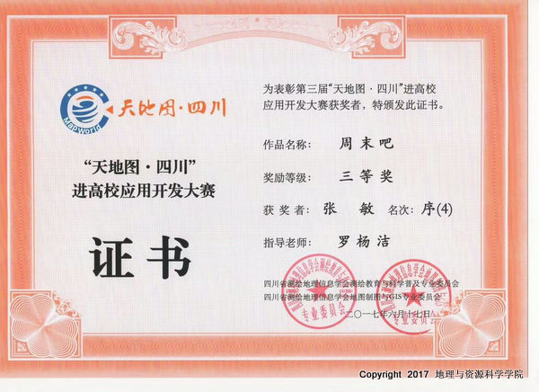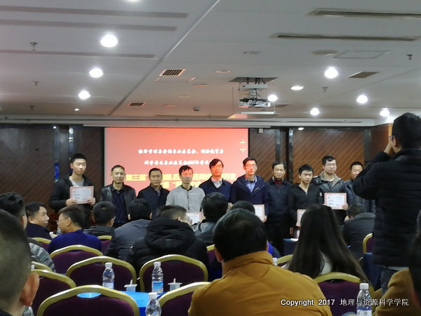 2017年12月15-16日,地资公司副经理罗杨洁副教授和人文地理与城乡规划教研室主任刘金梁老师参加了在成都召开的2017年四川省测绘地理信息学会学术年会。此次年会中,进行了第三届“天地图·四川”进高校应用开发大赛颁奖及总结工作,公司工程测量技术专业的徐兵同学、测绘工程专业的陈辰、赵美龄、张敏同学组成的“周末吧”团队获得了三等奖。
