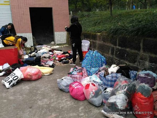 募捐箱分两批次放置,在第一次放置中,募捐活动便遇到了难题,除卢浮春天小区的箱子,其余小区募捐箱连同衣物都消失了。经过与老师商量,服务队立即组织了第二次募捐箱的放置,在大家的共同努力和社会好心人的支持下,服务队收集了大量的募捐衣物。2016年12月10日在四食堂旁空地进行衣物的进行了筛选,筛选出312件,约260斤保暖性较好、成色较新的衣物,共计17个包裹,打包寄往胜利小学。