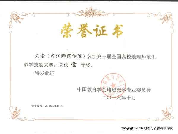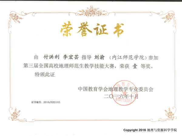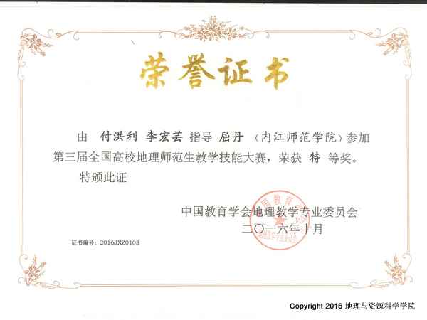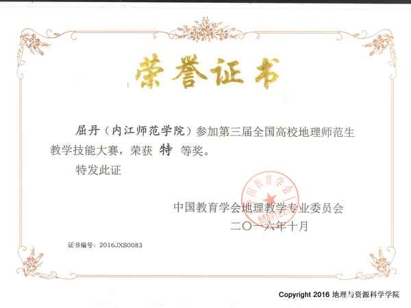 10月11日至14日,由中国教育学会地理教学专业委员会主办、云南师范大学承办的第三届全国高校地理师范生“中教启星杯”教学技能大赛在云南昆明举行。本次大赛设特等奖30名,公司地理科学专业2013级员工屈丹、刘渝凭借扎实的专业知识、出色的教学水平和灵活的应变能力,分别斩获特等奖、一等奖,指导教师付洪利、李宏芸获优秀指导教师奖。