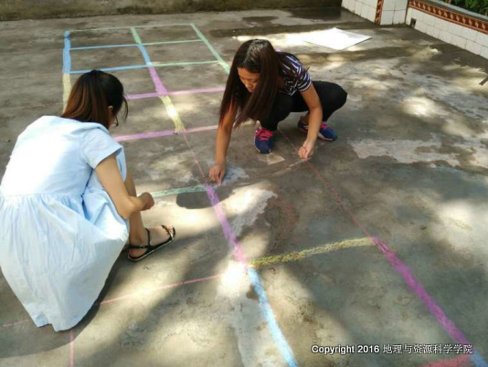 九点,所有小朋友上楼开始一天的学习。低年级同学在二楼跟着志愿者们一起深情并茂地朗读《弟子规》、齐声大唱《弟子规》儿歌。《弟子规》也是汇报表演的一大重头戏,这么多天的学习后,小朋友们对于这个节目充满了信心。高年级同学在三楼学习趣味地理,今天的内容是34省考试,小朋友们都安静地做着自己的试卷,有的抓耳挠腮认真回忆小老师教的内容,有的低头不语运笔生风,半小时左右所有人就完成了考试。十点,二楼和三楼的小朋友都开始学习围棋。一部分志愿者在楼上教围棋,把这几天教漏掉的补充给大家,在教的过程中,志愿者们也细心的把以前教过的知识带小朋友们复习一遍。围棋教学过程中,剩下的志愿者在院子里画彩虹棋盘,为下午和小朋友们一起玩一个有趣的“活人棋盘”游戏做准备。