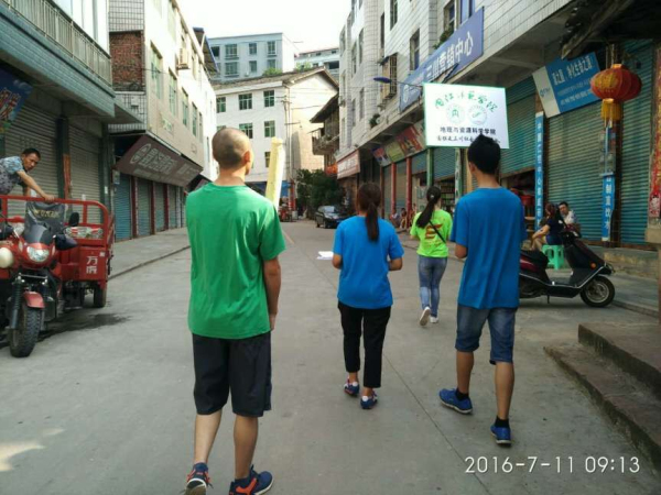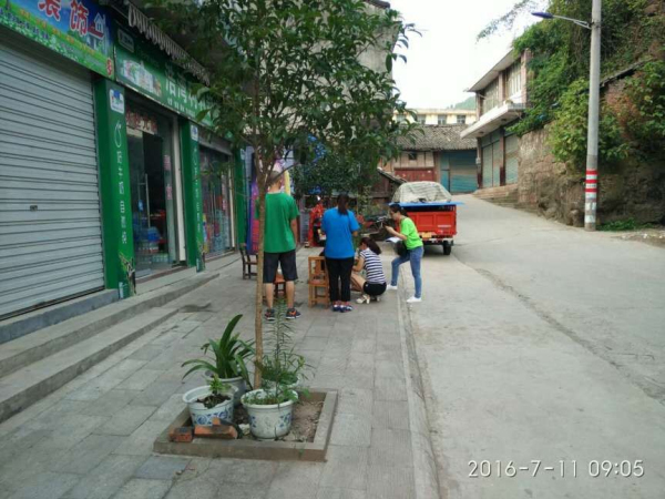 上午八点,志愿者们把全部活动用具拿到三川镇文化站后,带着宣传单,走上街头,开始向三川场镇的父老乡亲宣传本次义务志愿活动,招募员工。