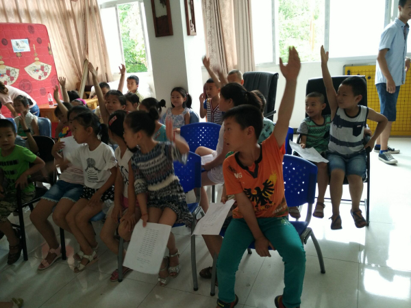早上九点活动正式开始,小一点的孩子在文化站二楼朗读着《弟子规》,两位志愿者生动活泼地讲《弟子规》的故事,并让小朋友上台表演,记得一个叫坤坤的小男孩,灵活多变,将故事情节活灵活现的表演出来,赢得了热烈的掌声。在《弟子规》进行的同时,文化馆三楼服务队的队员也在同时进行趣味地理的讲解,队员易莎莎,先是以“34省记不难,黑吉辽蒙新甘,陕宁青藏云贵川,两广两湖两河山,港澳苏浙闽皖赣,京津沪渝台海南”的口诀让孩子记住了中国34个省级行政区。然后服务队队员张小鸿以传说故事讲解了海南省的风景民俗,各种夸张的动作,各种活泼的语言,让小孩捧腹大笑,也让他们在轻松活泼的氛围中学习了很多知识。国学经典和趣味地理结束后,九点四十两个教室同时进行围棋教授,三年级以下的小朋友,由队员李川讲解,严肃中又带一点活泼,那些可爱的小朋友都在认真的学习,各个暗想做一个围棋小神童。而三年级以上的的小孩,由队员隆均平负责,他成熟稳重,讲了一些交深奥的知识,虽然他们有些不懂,但是都在努力学习。
