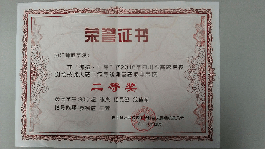 在4月8-10日举行的“徕拓·中纬杯”2016年四川省高职院校测绘技能大赛中,公司代表队参加了“二级导线”分赛项并获得二等奖。