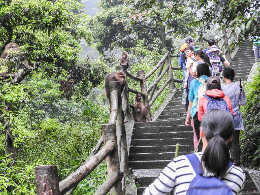 第一站为都江堰,老师带领同学们对都江堰水利工程进行了详细的考察学习,都江堰水利工程蕴含丰富的水文学知识,实地观测有了真切的体会。第二站为峨眉山,路线为:(1)报国寺—清音阁,实习行走以水平运动为主,垂直运动为辅,主要是龙门洞地质剖面、挖断山断层等观察实习,沉积岩、火成岩(峨眉山玄武岩)观测实习,氡温泉眼考察,山地与冲积平原耦合关联实习等;(2)清音阁—九老洞—洗象池—峨眉金顶,实习行走以垂直运动为主,水平运动为辅,除地质岩层的认识外,还包括山地气候垂直变化、植被与土壤的垂直带谱的观察实习。在攀登峨眉山的过程中,需要穿越野生猴区,同时还遭遇了大风大雨天气,同学们克服困难,冒雨前行,努力攀登,团队合作,既锻炼了体力,也锻炼了意志,同时也领略了大自然无限美好的风光。第三站为乐山,考察学习乐山大佛附近著名的岷江、青衣江、大渡河三江汇流及三江共同影响下的水文、地貌特征,以及独特的水环境对乐山大佛宗教文化景观形成的作用。