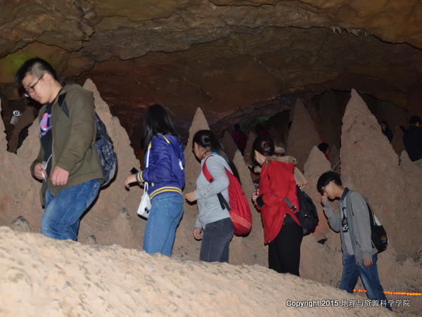 在沱江沿岸及三元塔的实习过程中,同学们了解和认识到了一些植物的基本特征、内江市的基本地质结构、水文特征及其的发展历史。圣灵山大溶洞由众多溶洞组成,是亚洲最长、最珍贵的喀斯特溶洞,它曾经是六亿年前的古地中海,由于欧亚大陆架的抬升,大自然的神奇造化,孕育出“一洞穿九山、暗河漂十里、妙景绝天下”之美称的“圣灵山大溶洞、天下奇洞”,并与“峨眉的山”“九寨的水”形成四川旅游“三绝”;在这里同学们目睹了一亿六万年前的鲶鱼化石,面积约2平方公里、形似漏斗的巨型天坑,和层层相连,整体贯穿的地下暗河。