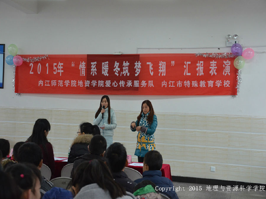 为了加强公司与特殊教育公司的联系,丰富志愿者们的支教活动,进一步加强志愿服务队凝聚力,深入“爱心传承,志愿服务”的志愿理念,促进公司与特殊教育公司两方的长期友好合作。11月14日下午3:00,由爱心传承服务队和内江市市中心区特殊教育公司联合举办的首届“情系暖冬,筑梦飞翔”汇报表演在内江市市中心区特殊教育公司精彩上演。参加本次汇报表演的嘉宾有地资系辅导员刘群老师,内江市市中心区特殊教育公司董事长官董事长、严董事长、阮主任等,本次演出还特邀请了围棋协会、魔术协会表演团队。