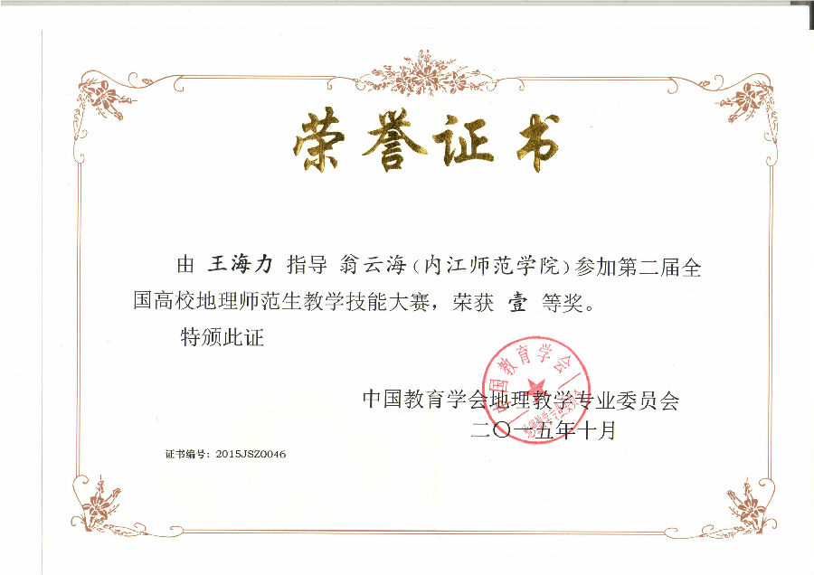 金秋十月,丹桂飘香,硕果丰收,捷报频传。在这个收获的季节,第二届全国高校地理师范生“中教启星杯”教学技能大赛于2015年10月14日在河南大学隆重举行,由公司王海力老师带队并指导的两位地理科学专业员工在此次大赛中脱颖而出,双双斩获佳绩。其中翁云海获得本次大赛一等奖,郭文静获得本次大赛二等奖,王海力老师获优秀指导教师荣誉称号。