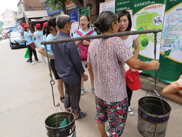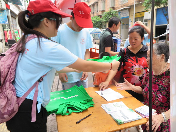 下乡宣传的工作是需要耐心与热情的,连续3天,志愿者们每天早上7:30就出发,分别奔赴了内江市史家镇、高桥镇和资中县银山镇三个地方。为让活动不流于形式,志愿者们对每次的活动做了具体规划和分工,如联系政府相关工作人员、设点、摆展架、拉横幅、环保知识宣讲、赠送环保手册与环保袋、协助当地环卫工人清扫街道等相关环节。每到达一个新的乡镇,志愿者们身上就充满了干劲,积极地将自己所知所学的环保知识分享给当地的群众,以让环保理念深入人心。在几天的下乡宣传中,有的乡镇地理位置偏僻,中途需要转两次车,为了节省不必要的花销,志愿者们早晨脚踏着晨光徒步去车站,中午头顶烈日从车站步行回公司。虽然有时会感觉到身体疲惫,但更多的时候他们的内心是满足和欣喜的,因为他们正在为自己所热衷的环保事业而努力,就如志愿者李玲说的那样:“艰苦的条件并不能使我们退缩,相反会将我们越挫越勇,只要有人愿意听我们普及环保知识,所有的疲惫都是值得的。”