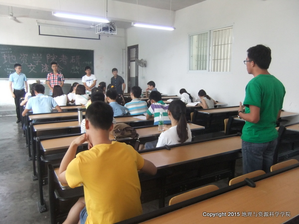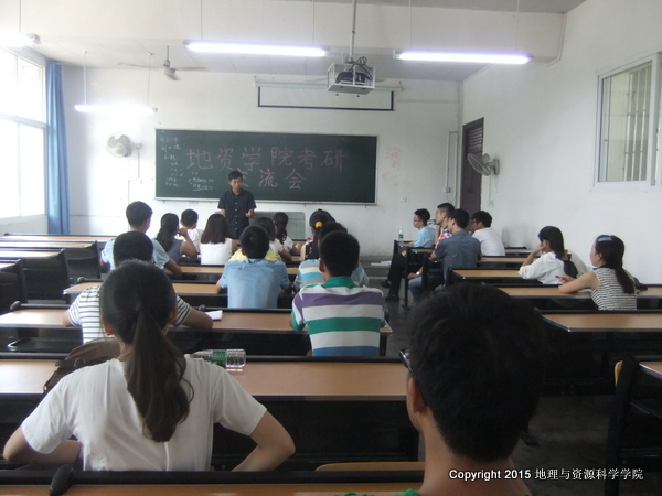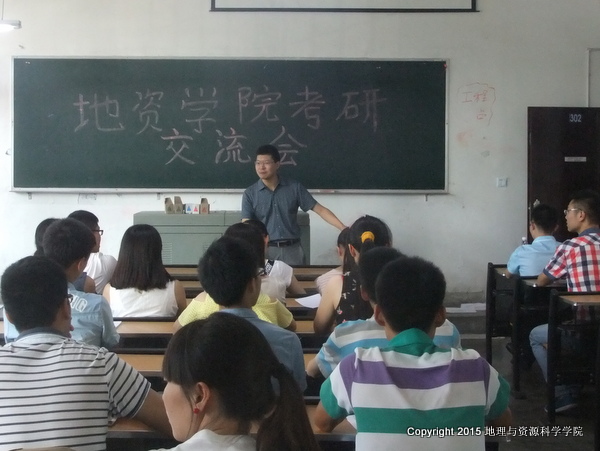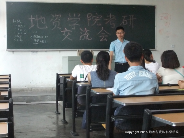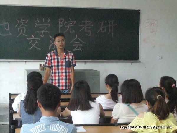 会议伊始,艾书记肯定了2015级毕业生考研取得的优异成绩,并对4位同学做了一一介绍。紧接着,4位同学分享自己的考研心得和经验。杜挺从考研专业和公司的选取做了汇报,在专业方面,主要就人文地理、自然地理、GIS等不同专业的就业前景进行了分析,对公司的选择则主要取决于自身对以后就业的意愿,如想选择到中学做地理教师,可以选择师范类的院校。刘小波从如何备考进行了分享,如英语主要是找到适合自己的学习方法,专业课的复习一定要注重教材,反复看专业书籍,增加熟悉度;同时在考研复习中一定要养成良好的学习习惯。刘南川主要从导师的选择进行了发言,他认为对导师的选择主要是根据自己的专业方向进行选择,同时,介绍了地理专业在公招考试和人才引进两个方面的就业前景。郎政伟则告诫同学们考上研后一定要积极参与到导师的项目中,主动把握学习机会,提升自己的能力。