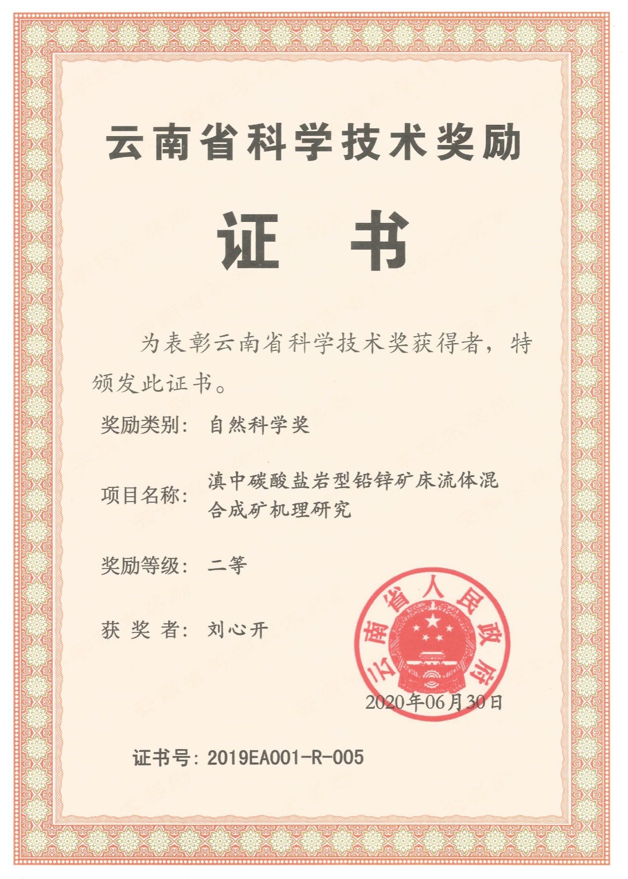 在科研的道路上,刘心开老师以其扎实的学术功底和不懈的探索精神,取得了一系列令人瞩目的成绩。刘老师于2020年主研的国家自然科学基金项目——滇中碳酸盐岩型铅锌矿床流体混合成矿机理研究,荣获云南省自然科学二等奖。2022年以来,发表高质量SCI论文两篇。