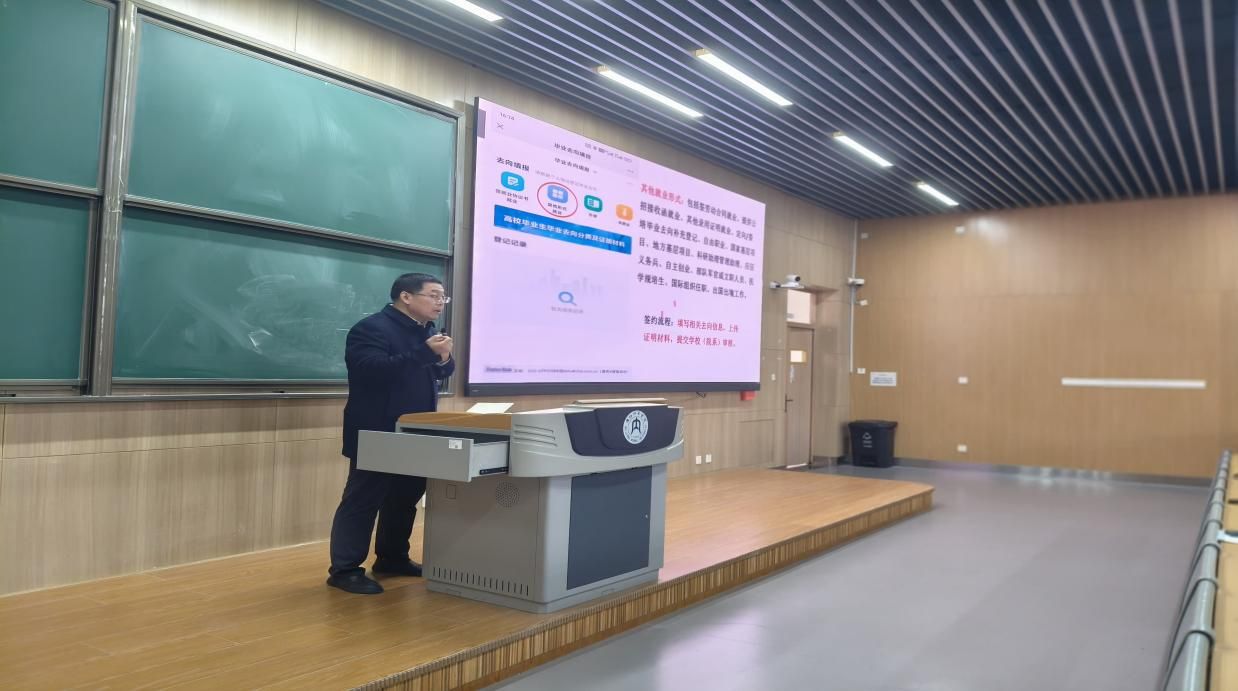 首先,学工办老师陈洪亮解读了目前全国高校毕业生严峻的就业形势,希望同学们要珍惜眼前就业机会,抓住机遇,把握好就业时机,同时鼓励同学们在找工作中多向单位投递简历,不断积累面试经验。