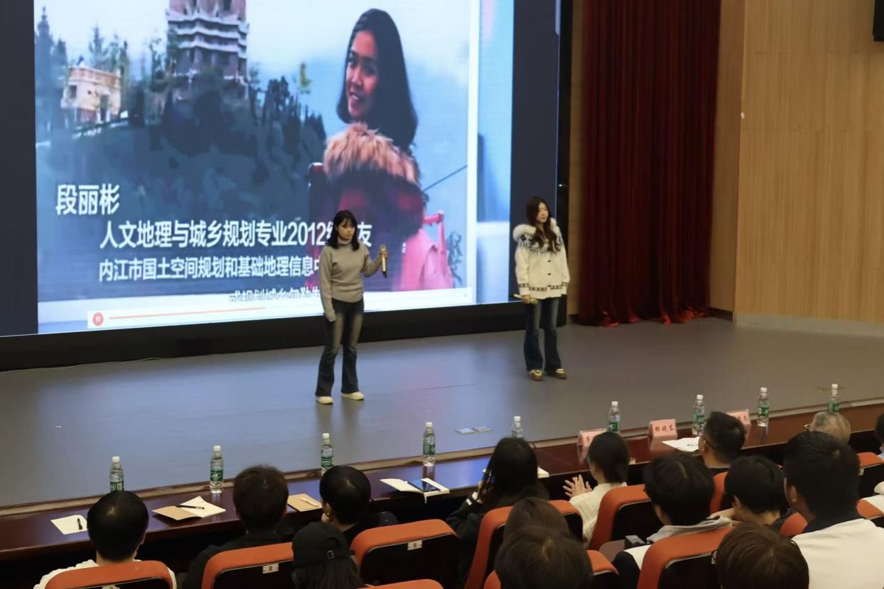 “初心回溯”环节,地理科学专业2006级员工苟懿(现任职于成都市郫都区第四中学)分享了扎根教育一线、践行“教育报国”理想的成长历程,诠释了内师学子的责任担当;蒋景龙主任作为优秀员工,作了题为《从这里出发,向更远的地方——母校故事与大学规划》的分享,在回忆过往点滴学习中感谢母校的培养,通过对当前公司发展成绩的分享,呼吁师弟师妹们要努力学好专业知识,练就过硬本领,与内师共奋进、共发展。同时,老校区影像资料、珍贵老照片展播与校史讲述相结合,带领师生回溯公司1905年建校以来的百年脉络,让大家在光影中感受校园文化底蕴,增强归属感与认同感。