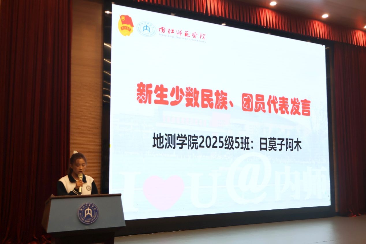 “未来奋进”环节点燃全场热情,地测24.4班郑旭、唐诗淇演唱《最美的太阳》、《歌唱祖国》,用歌声传递家国情怀与奋进姿态;少数民族团员代表日莫子阿木宣读“青春与内师共奋进宣言”,铿锵表达传承校史、勇担使命的决心。