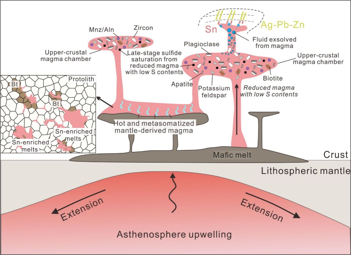 义敦地块位于青藏高原东部三江特提斯成矿带核心区域,是我国重要的锡-铅-锌-银多金属成矿集中区,北段发育大量热液-矽卡岩型矿床,具有巨大的资源潜力。该研究聚焦核心科学问题是:义敦地块晚白垩世花岗岩成因类型(I 型、S 型或A型)的长期争议如何厘清?锡多金属矿的成矿时代与锡元素富集机制能否明确?针对这些关键问题,研究团队以义敦地块中部措莫隆锡矿床为重点研究对象,综合运用锆石与锡石U-Pb定年、黑云母微量元素分析和瑞利分馏结晶模拟,系统开展花岗岩成因与锡矿化机制研究,揭示了晚白垩世花岗岩的成岩成矿完整过程。
