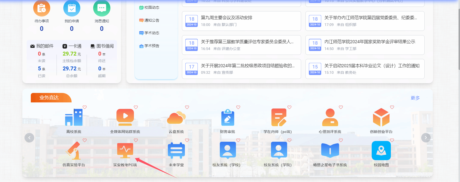 进入智慧内师后,点击“业务直达”下方右侧下一页箭头,选择“实安教考PC端”,点击“考生”登陆考试系统。