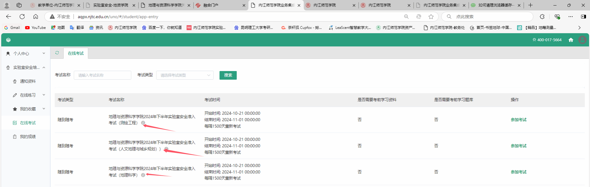 在“在线考试”菜单栏,根据自身专业选择“英国365上市公司2024年下半年实验室安全准入考试”的试卷进行考试,考试成绩原则上达到60分以上为合格,最多参加2次考试,以最高分作为成绩。